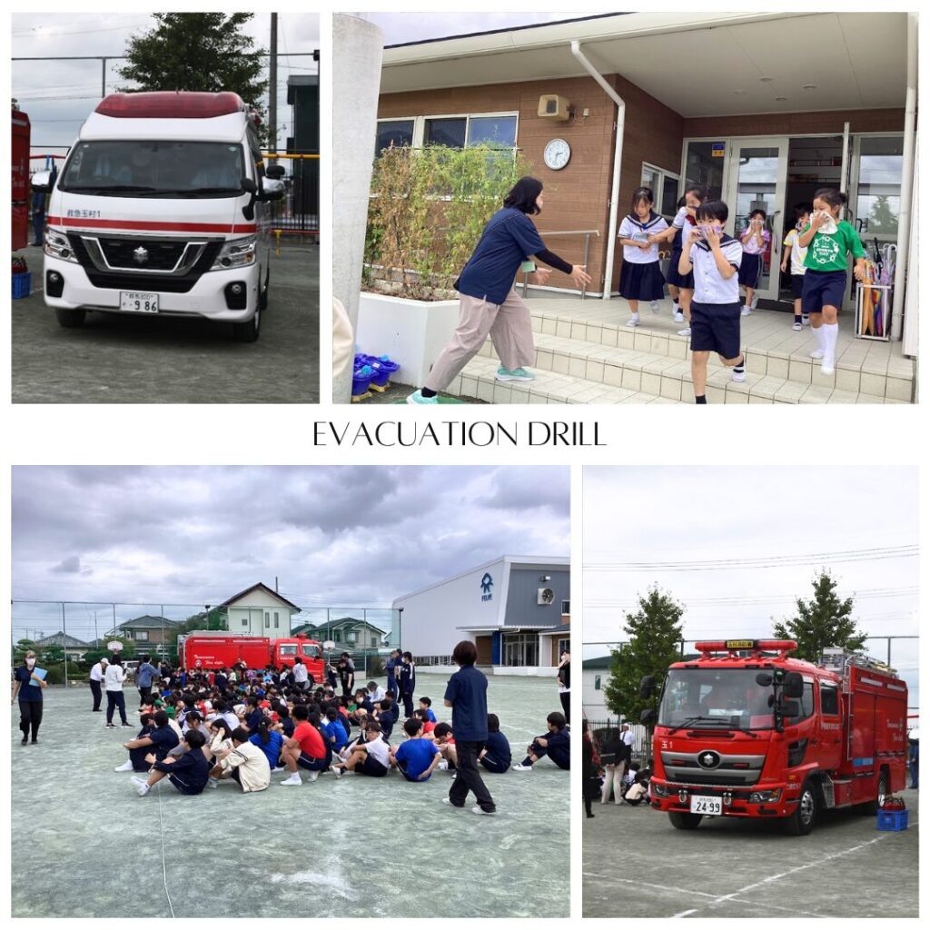 今週は玉村消防署の方々に避難訓練にお越しいただき、安全確保の訓練を行いました。迅速かつ静かに避難する方法や、正しい消火の仕方を練習しました。消防車と一緒に写真を撮る機会もありました!玉村の消防士の皆さん、安全な火災時の行動について教えてくださり、本当にありがとうございました。