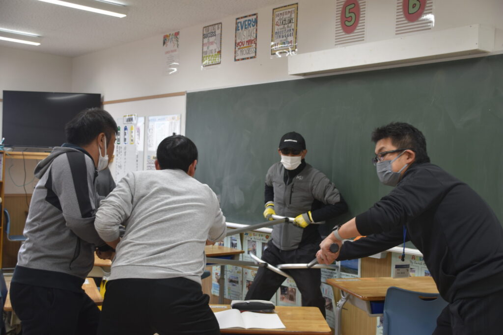 教室では先生たちの訓練をしました。 机、椅子、清掃用具、さすまた等を使い距離を置いて対応し時間を確保することが大切だとういうことです。